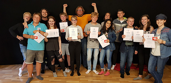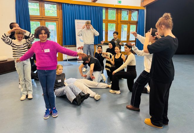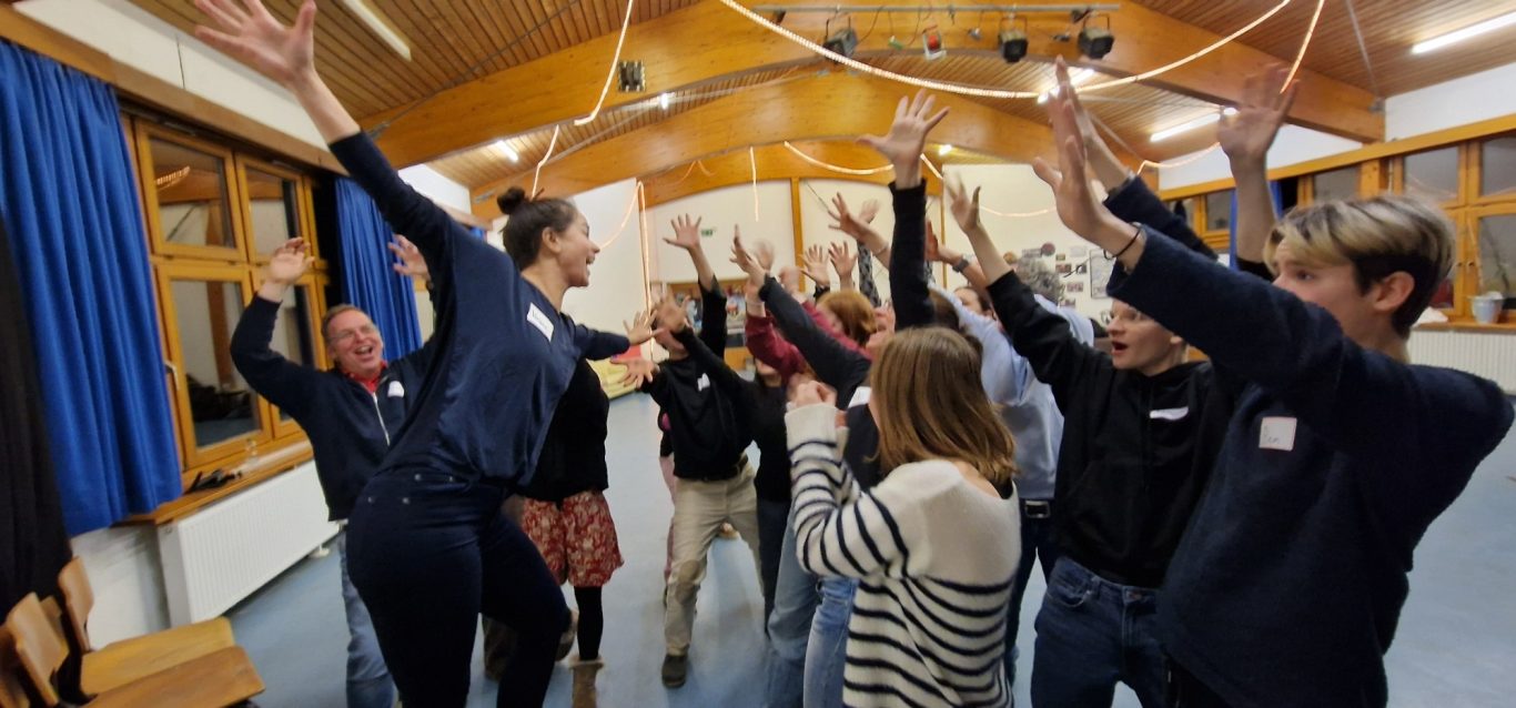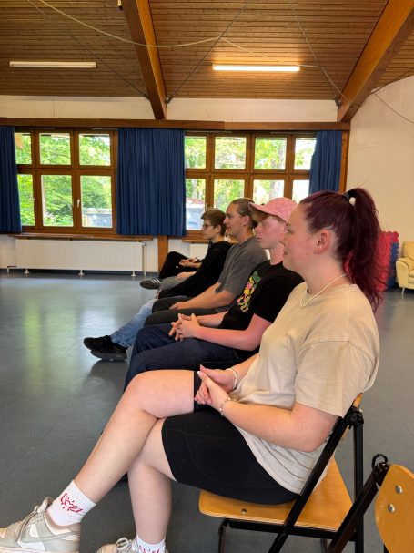 Eine besondere Rolle kommt besonders engagierten Schüler*innen zu: Sie werden auf der Meta-Ebene, also zusätzlich zu dem Programm für die ganze Gruppe, in Wochenend-Workshops auch darin trainiert, Impro an andere Schüler*innen im Peer-To-Peer Verfahren weiterzuvermitteln. Deswegen nennen wir sie auch einfach die Peers.