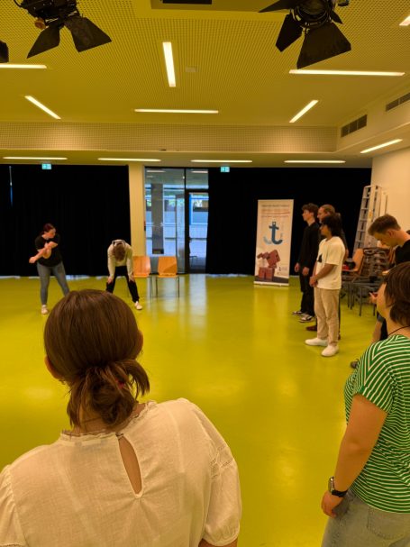 Fotos (Ruffer, Rechte frei) unser erster Peer-Jahrgang mit Thorsten Brandt Steife Brise, typische FoBi-Situation mit Coach Viviane von der Brise bzw. Törn e.V. im Pink-Haus und erstes überbezirklíches Impro-Match an der GSB